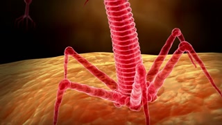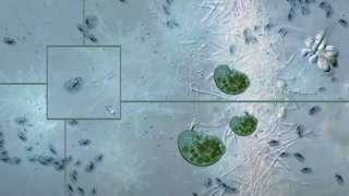 An animation imitating a view through a microscope, with a predator microbe crossing paths with another microorganism, attacking it, and eating/absorbing it.