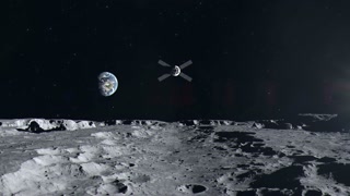 Lunar program, the spacecraft flies over the surface of the moon. The Earth rises above the horizon of the Moon. Cinematic detailed 3d animation. Visualization of the space program of flights to the