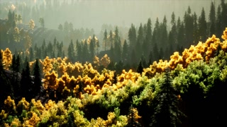 Sparkling coniferous forest in the mountains during fall sunset