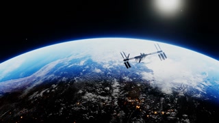 Spacecraft deploying solar panels using modern space technology during the night. Orbiting spaceship in the univers, shuttle into atmosphere. Images from NASA. 3D render animation