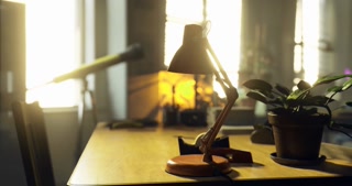 Desk with lamp and plant in a dimly lit classroom during the evening