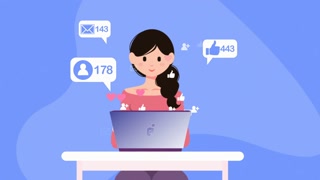 Girl Using Social Media on a Laptop tracking Likes Messages Emails and follower count Flat Design Character Animation
