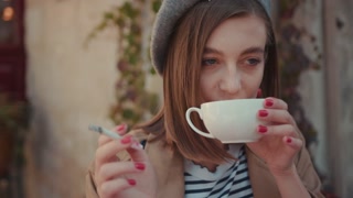 Face blonde girl woman smoking cigarette at cafe smile wearing stylish coat look around sunny day sitting in cafe on breakfast croissant