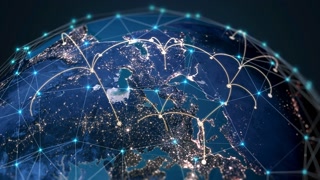 Earth globalization in 3d motion graphic. Transfer 5g web communications signal on worldwide. Global business dots on rotating planet.