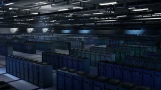 Server hub rackmounts operating massive datasets used in deep learning processes, aerial shot. Data center technology operating