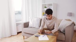 savings, finances and people concept - indian man with papers and calculator counting money at home