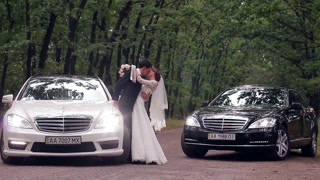 Wedding day. Newlyweds kissing in a park near the Mercedeses.