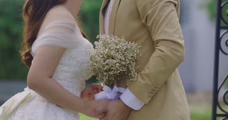Slow Motion Asian Couple Holding Hands Together. Happiness Moment In Love Of Couple In The Wedding Day Ceremony.
