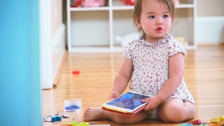 Happy toddler girl enjoying watching her tablet computer
