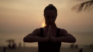 Young woman meditating on tropical beach at sunset