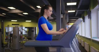 Fit woman running on treadmill in gym. Girl running on treadmill in sport gym. Slow Motion.