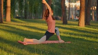 Fitness enthusiast practicing yoga and pilates in a beautiful park during a sunny morning. Outdoor training in nature.