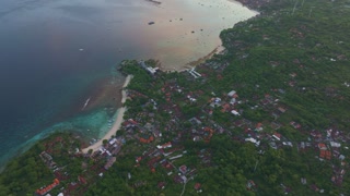 Aerial view of lush forest, village homes, and valley at sunset, Ubud, Bali, Indonesia.