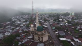Aerial view of village, mosque, and mountain with cloudy sky, Sembalun, Lombok, Indonesia.