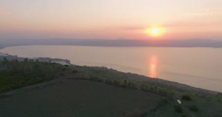 Panoramic aerial view of a lake in sunset, Sea of Galilee, Israel.