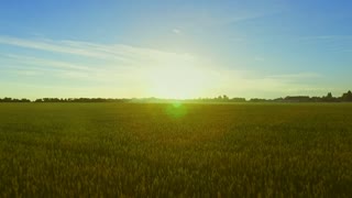 Flying to sunset over field with ripe wheat