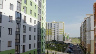 Panoramic view of the blocks with residential apartment buildings from a bird's-eye view. Drone video on a sunny day