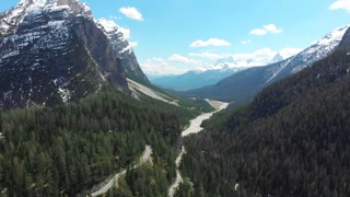 A drone video shot over a gorge in the Basque Country, with snow-capped mountains above and forests below
