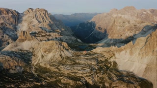 Aerial view over Locatelli Dreizinnen refuge at Three Peaks of Lavaredo - Tre cime di Lavaredo. Sexten Dolomites Alps, Italy
