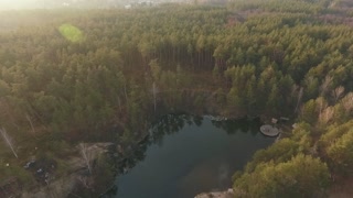 A top view of a lake in the middle of the forest. Shooting from the drone.