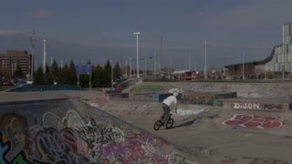 BMX stunts on a bike in a skatepark