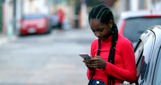 young African Girl Texting On Cellphone On street leaning on car