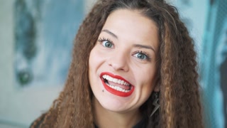 "videoblocks camera zooming in on the face of the beautiful young caucasian happy teenage girl with long waving hair smiling to the camera outdoors on the red glass background portrait close up_bvw1ezkih_1080__D.mov"