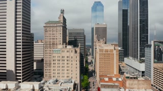 Aerial view buildings downtown. Mixture of old and modern tall buildings in city. View from ascending drone. Dallas, Texas, US