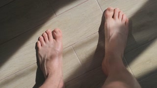 A man stands on the sunlit floor barefoot in the morning, close-up. Male feet on a warm floor made of wood or tiles