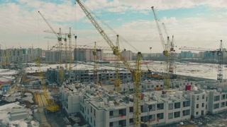 new building district construction site with yellow non-functioning cranes on spring cloudy weekend aerial motion