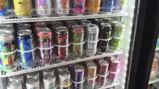 Energy drinks section of gas station cooler 4k