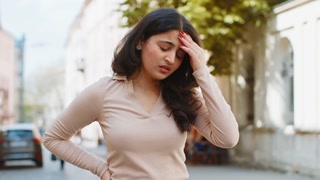 Sad unhappy frustrated Indian woman walking alone in city street feeling bad annoyed grief problem