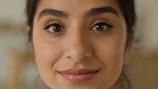 Close up portrait teen Indian Arabian ethnic woman girl female student businesswoman slowly opening eyes looking at camera toothy white
