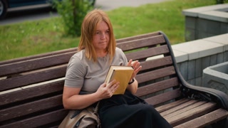 Woman sitting alone on bench outdoors reading book, flipping to new page then closing it and pressing to chest in thoughtful emotion and