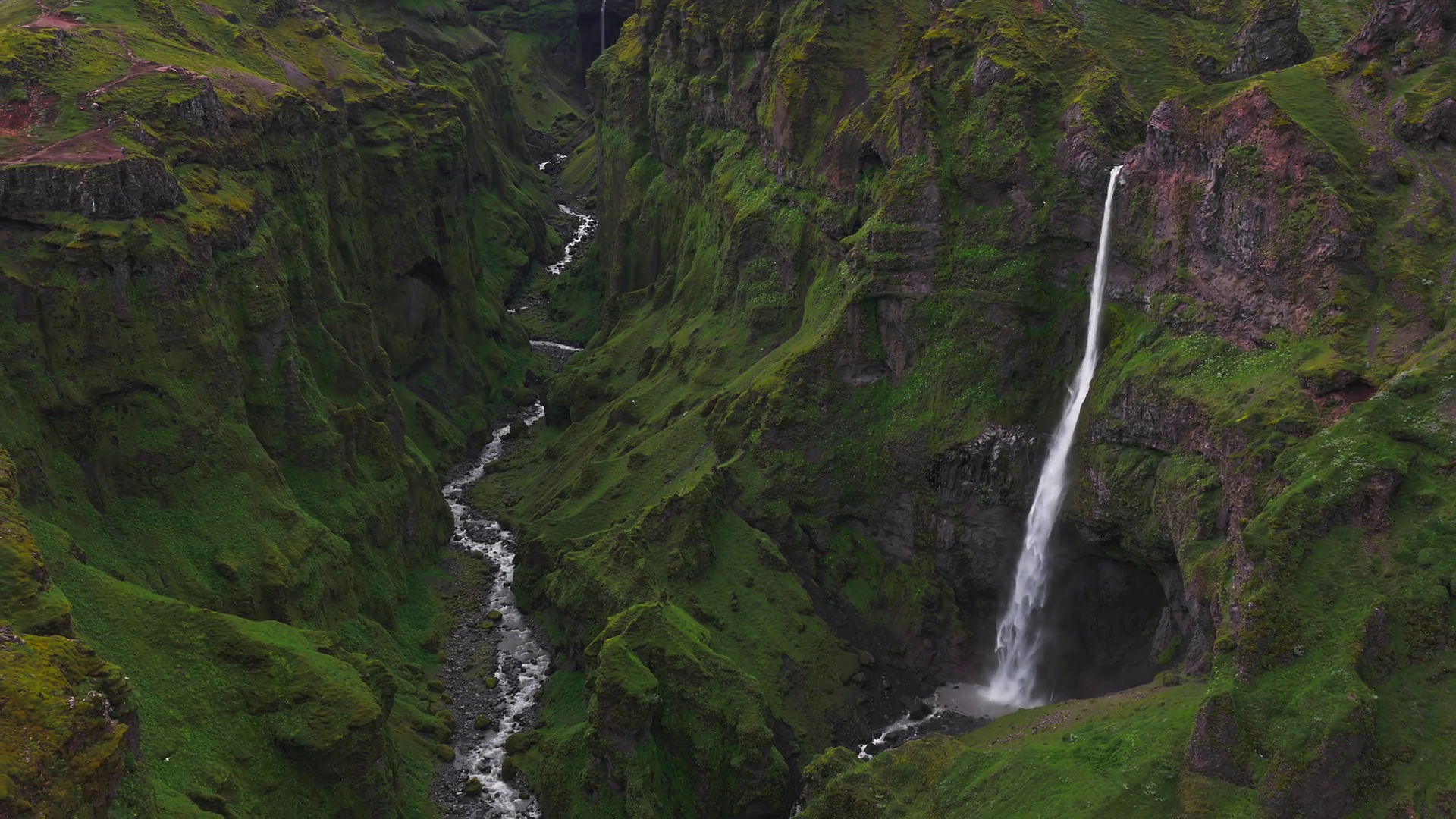Aerial View Of A Green Canyon In Iceland With A Waterfall Cascading Into A Winding River Moss Covered Cliffs And Flowing Water Create A Dynamic Scene