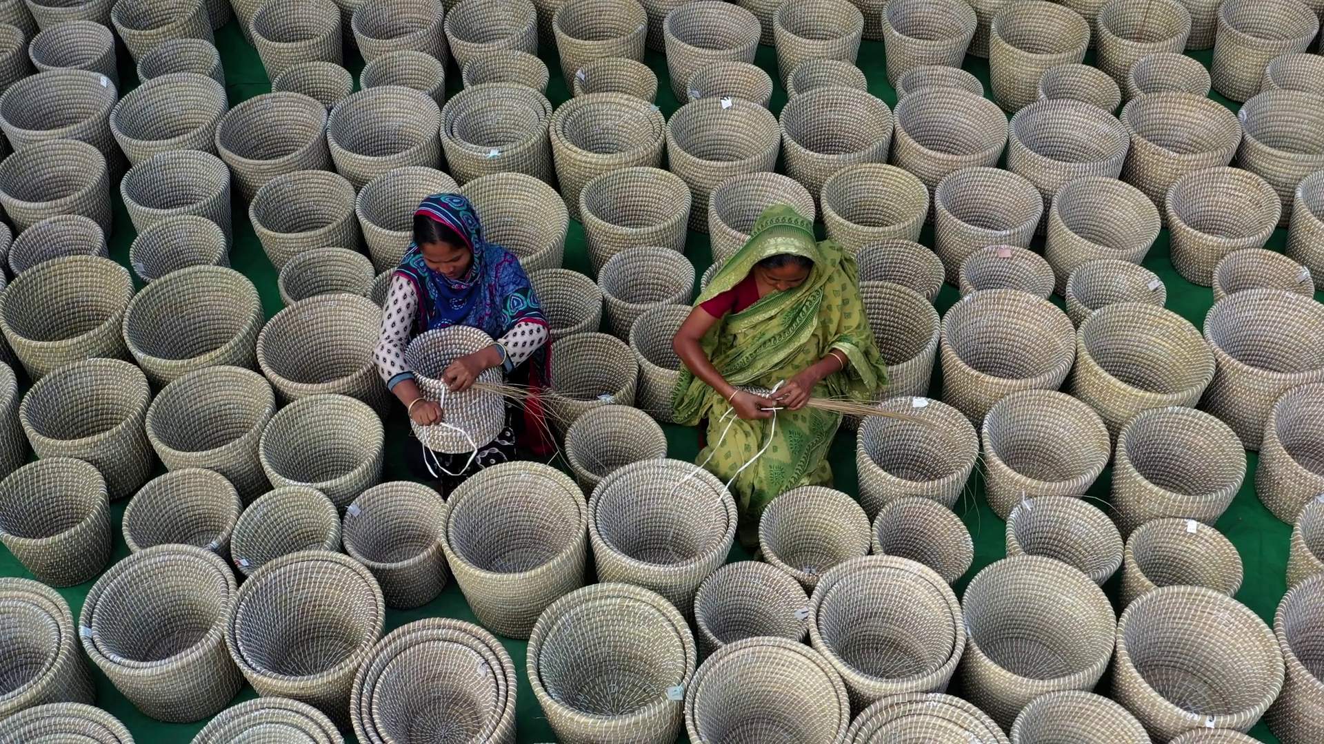 Aerial View Of Women Weaving Baskets Bangladesh