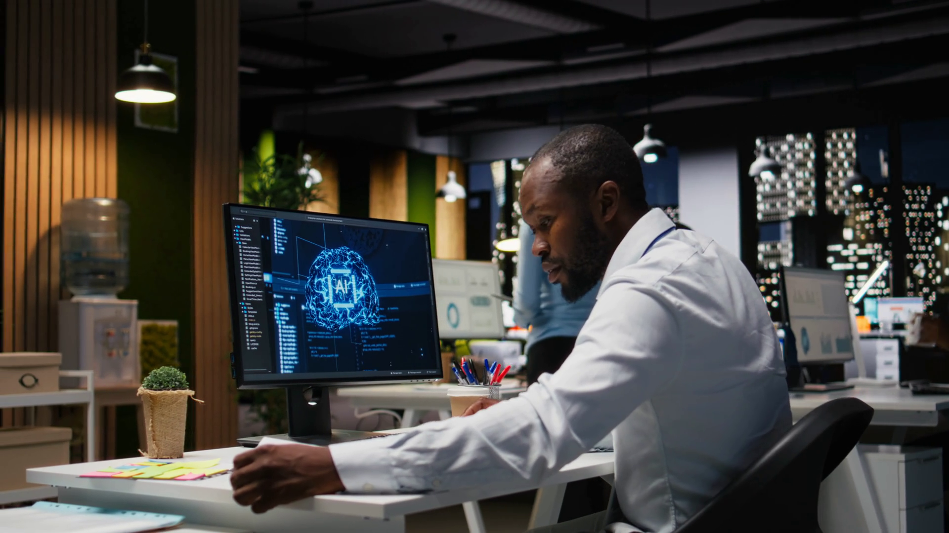 African American Worker Checking Kpi Metrics Data With Artificial Intelligence Tools On Pc Working With Ai Neural Networks For Machine