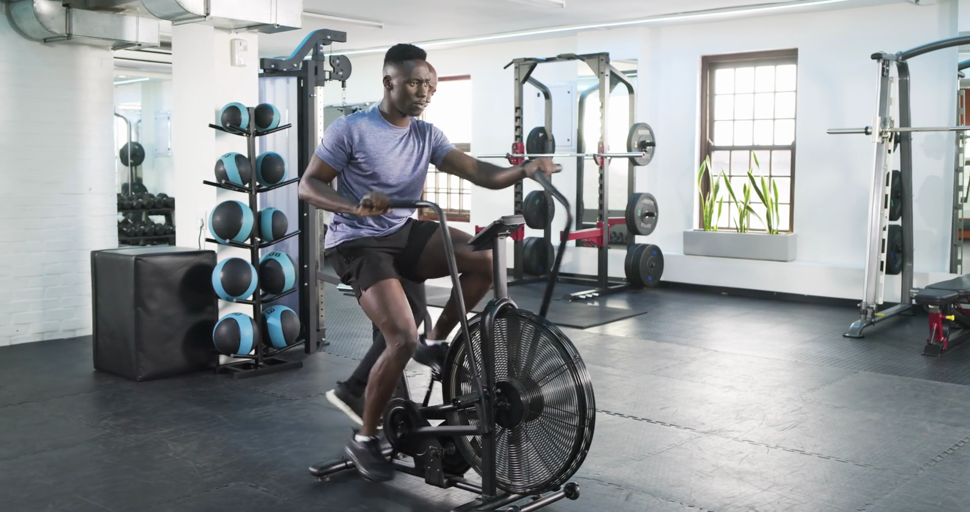After Trainer Cue African American Male Client Pedaling Air Bike In Gym To Improve Fitness