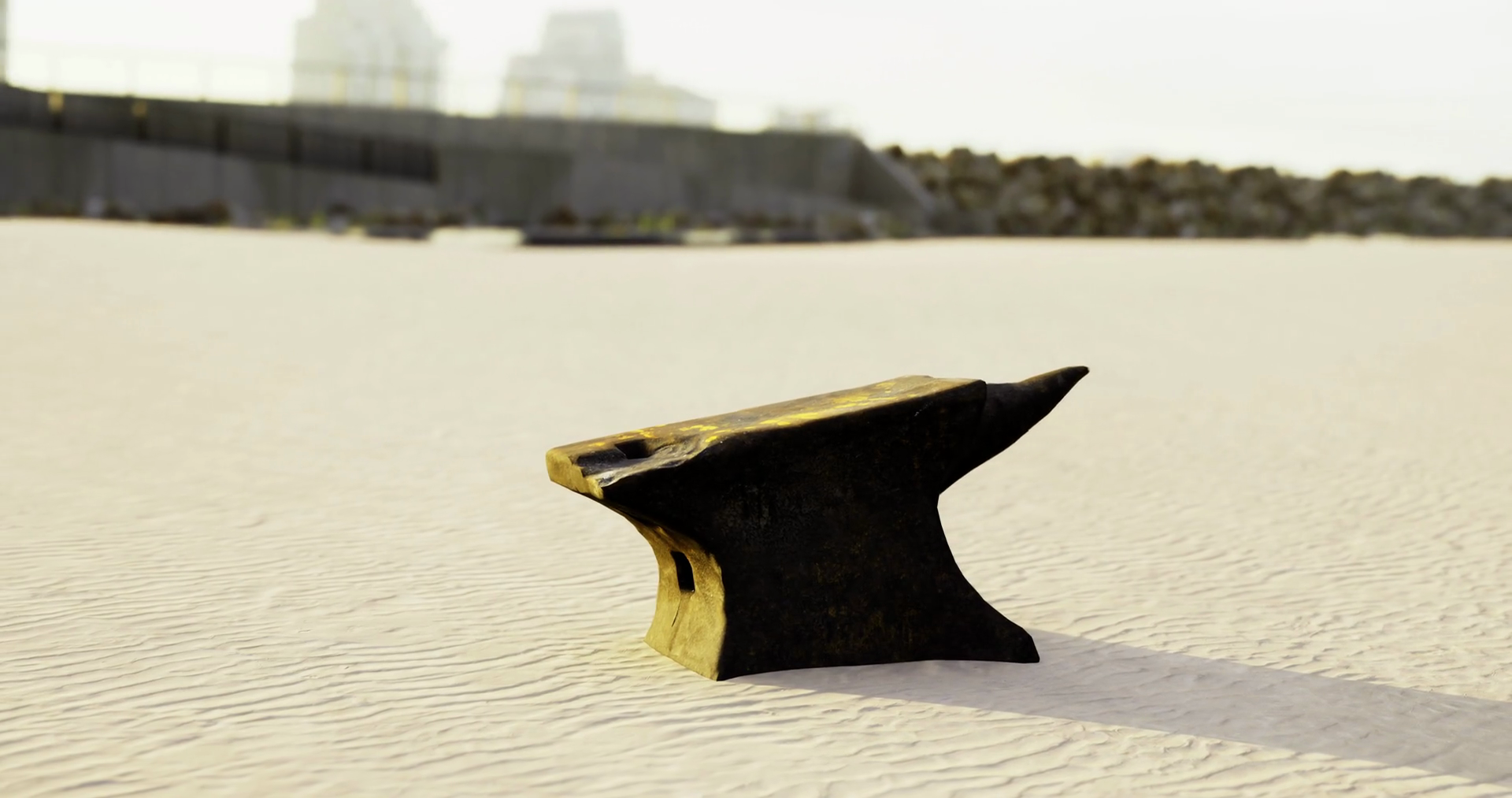 Anvil Situated On Sandy Terrain With Structures In The Background