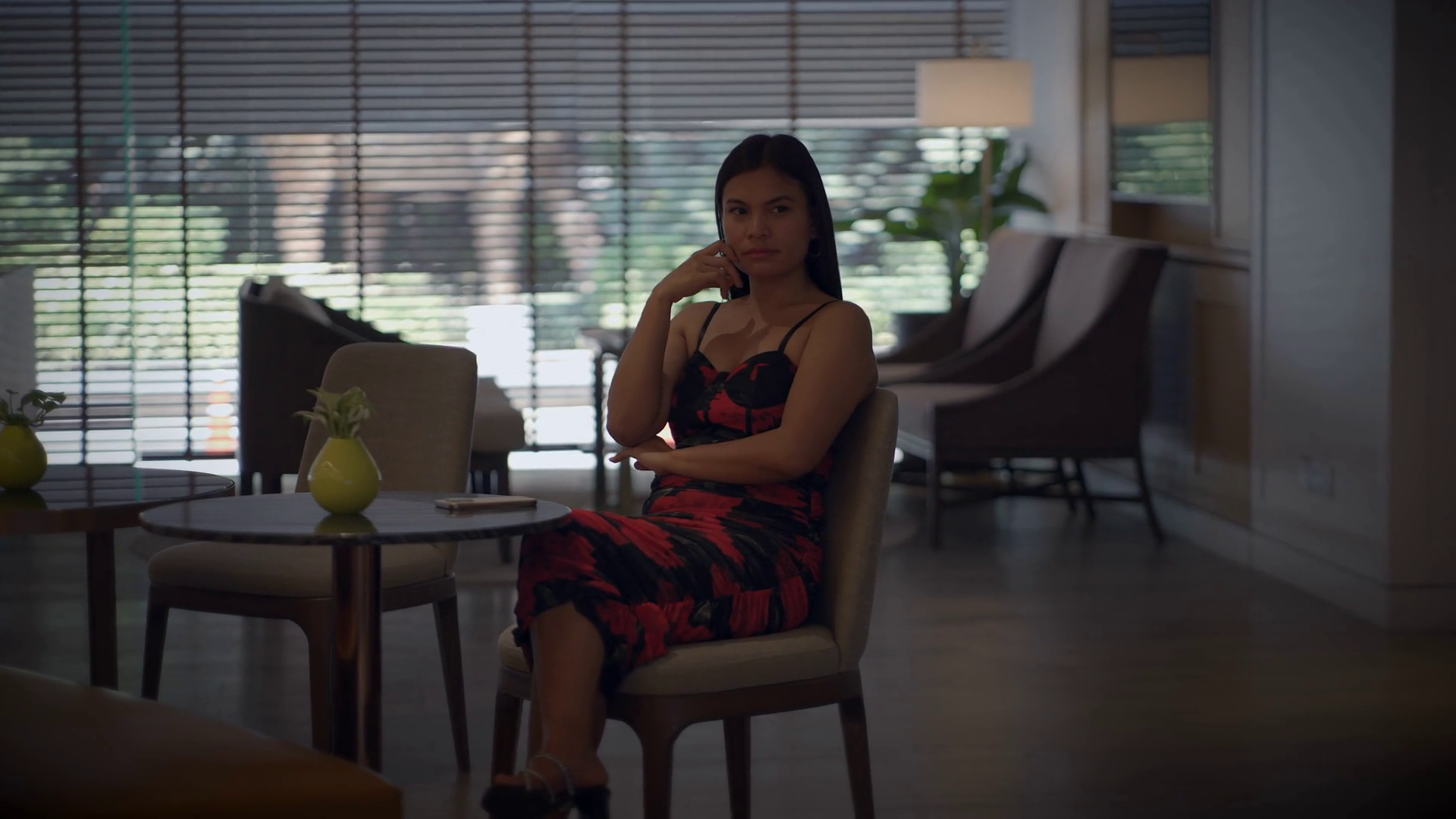Asian Woman Pondering Asian Woman Sitting Thoughtfully Amidst Muted Lobby Lighting And Plants