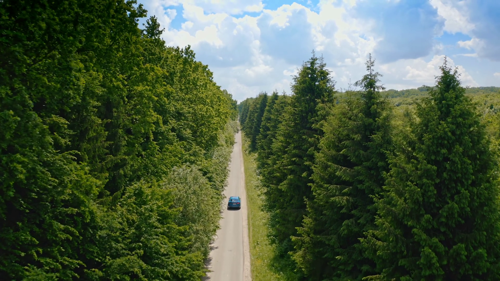 Car On A Road Among Amazing Green Nature Blue Electric Automobile Moving Eco Vehicle Driving In Summer