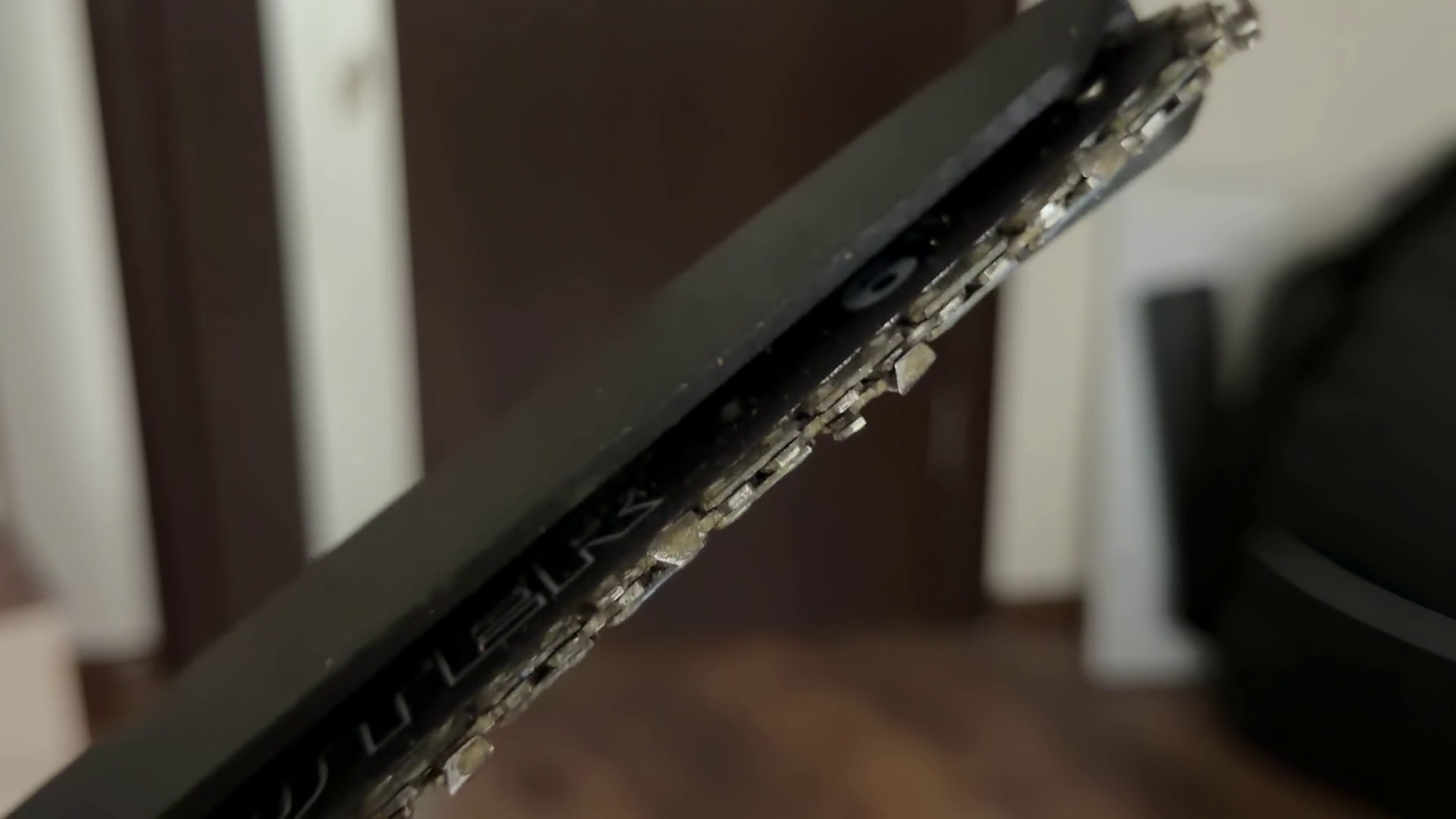 Closeup View Of A Chainsaws Sharp Metal Chain Teeth Moving Quickly Along The Guide Bar Showing The Powerful Mechanics Of The Cutting Tool