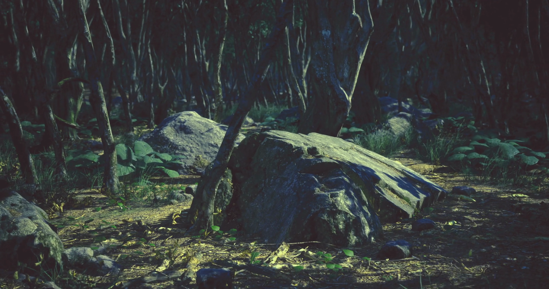 Exploring A Dense Forest With Large Rocks And Trees Under Soft Light