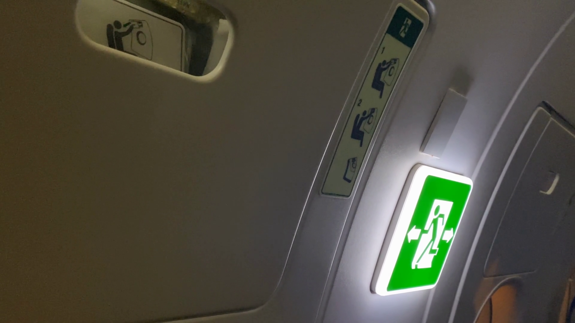Green Illuminated Emergency Exit Sign Near The Entrance Door Of Aircraft Running Man With Two Arrows Pointing In Both Directions Rules And