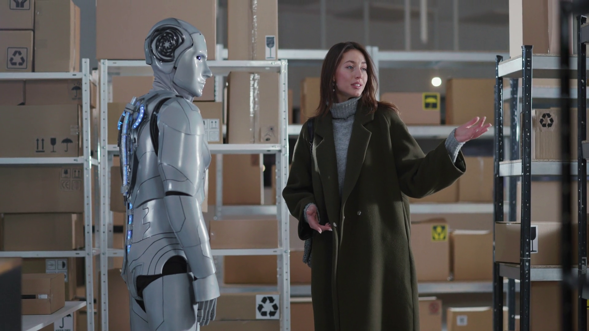 Human Interaction With Ai Robots Concept Young Woman Employer Hiring Cybernetic Automated Robot For Heavy Work In Storage Room Post Office