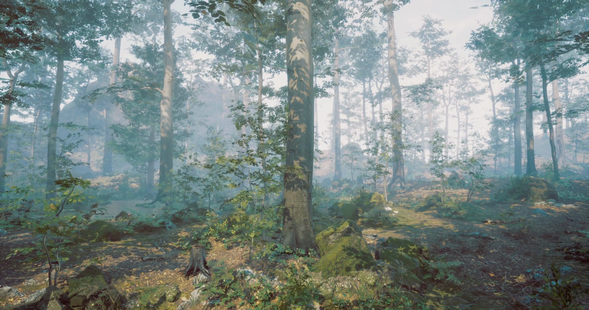 Lush Forest With Mist And Sunlight Filtering Through Tall Trees
