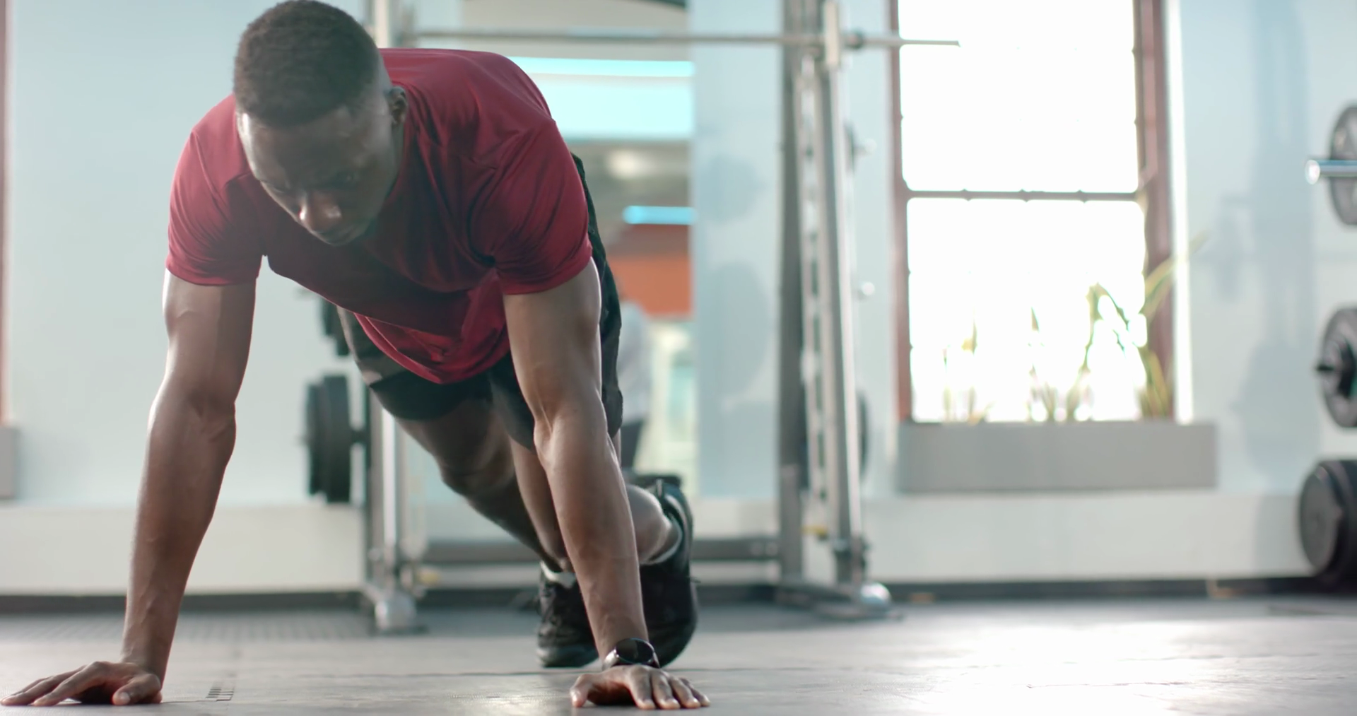 Man Is Getting Into High Plank On Gym Floor Then Driving Knees Alternately For Core Stability