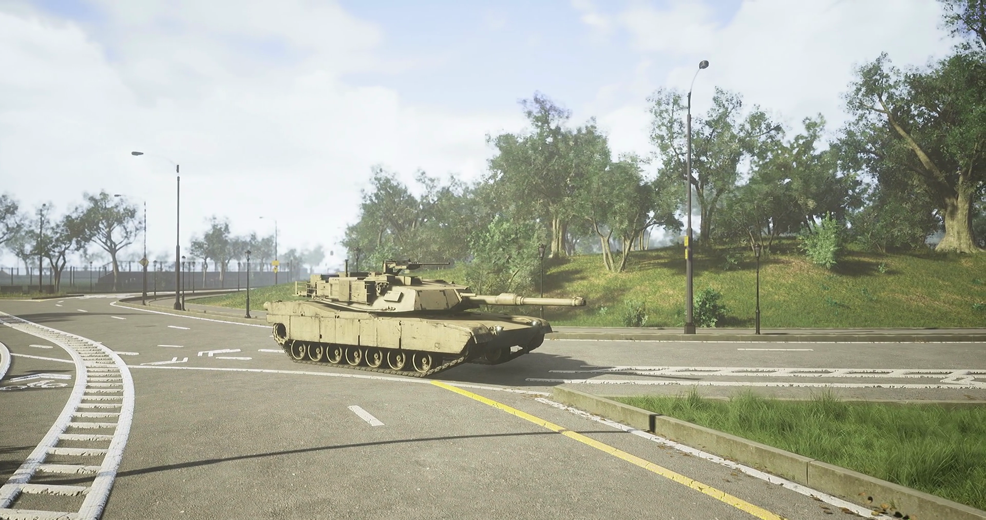 Military Tank Maneuvers Through Urban Landscape On Sunny Day