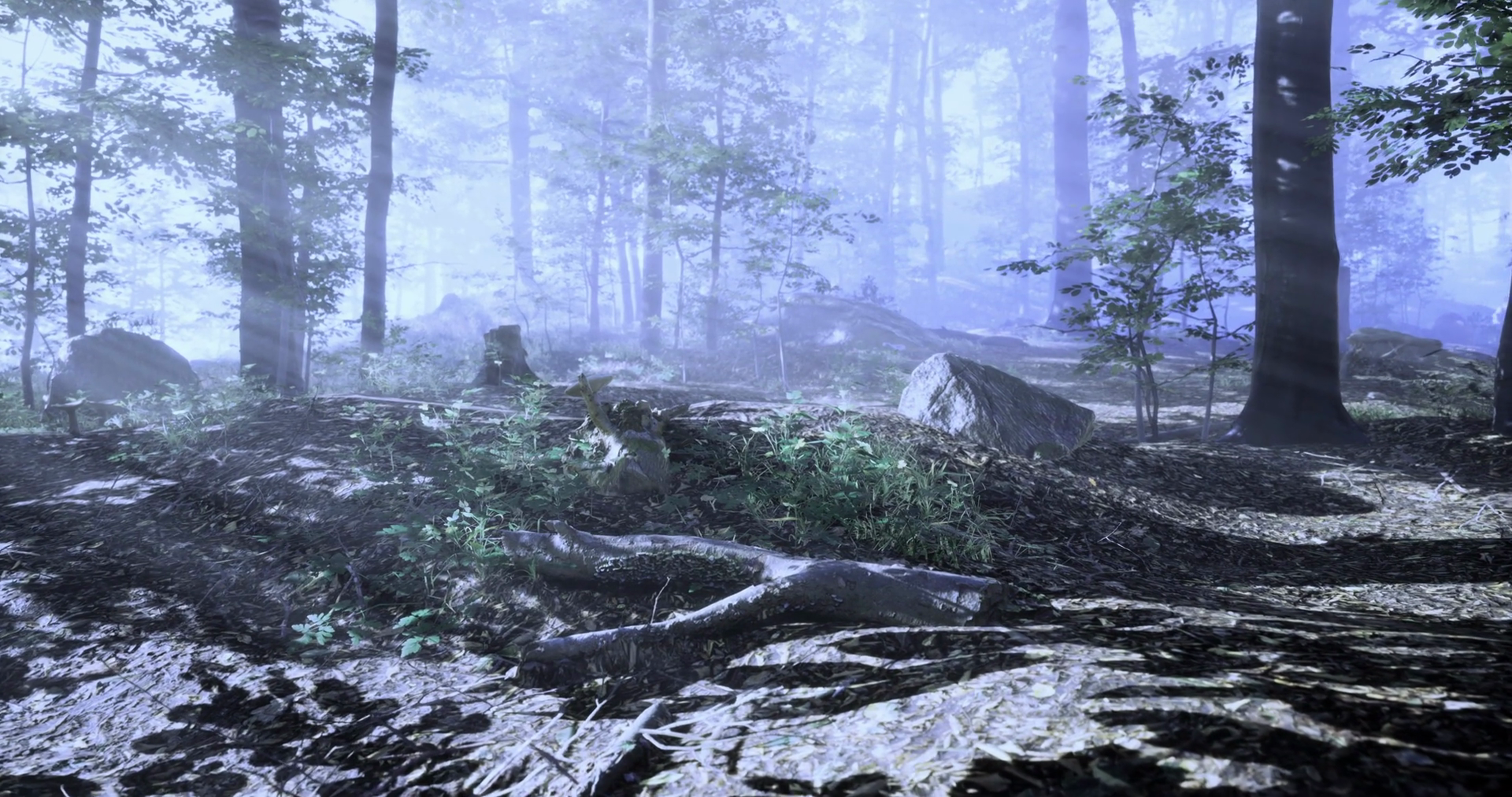 Misty Forest With Soft Light Filtering Through Trees In Early Morning