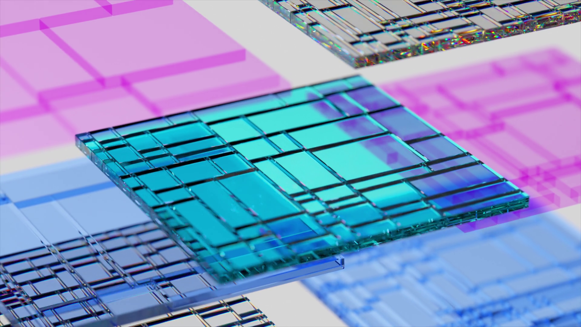 Multiple Transparent Semiconductor Cpu Chips In Blue Light Blue And Purple Are Rotating Slowly On A White Background Creating An Abstract